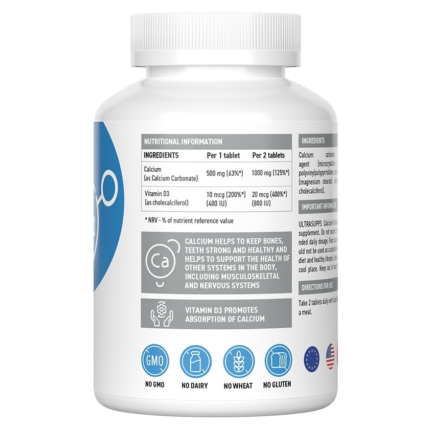 Комплекс Ultrasupps Calcium + Vitamin D3, где кальций представлен в биодоступной форме карбоната в сочетании с важнейшим витамином D3, хорошо усваивается организмом. Синергия кальция и витамина D3 увеличивают положительный эффект от приёма.